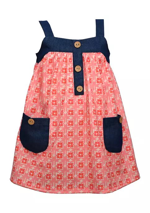 A denim trim and patch pockets pop off of a coral-colored pattern on this girls dress by Bonnie Jean.