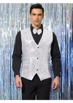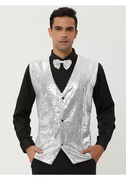 Budget 🔔 Lars Amadeus Men’s Sequin Shiny Slim Fit Vest Sleeveless Suit Waistcoat Set with Bow Tie 🎉