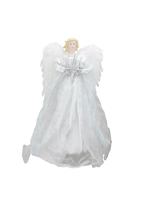 This large hanging angel holding a silver star will be the focal point of your holidays. Dressed in white with silver glitter designs makes this angel the epitome of elegance and grace. She can hang over your tree or be sat on a mantle or tabletop for display the possibilities are endless