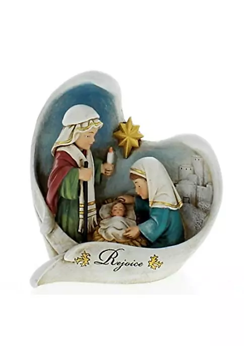 Decor reads “Rejoice” below baby Jesus