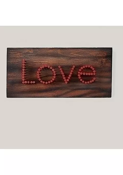 The word “Love” is spelled out by hammered nails that each feature a painted red tip