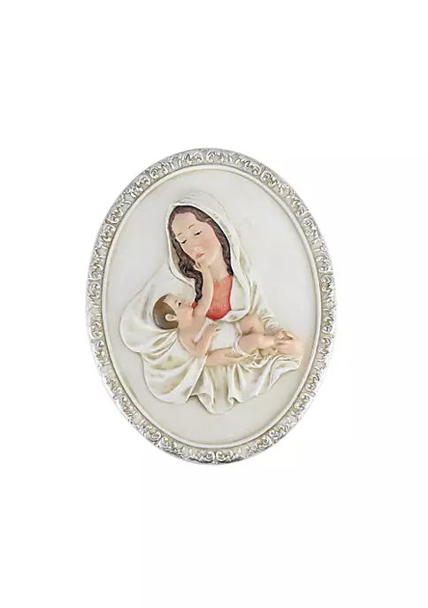 This religious children’s wall plaque depicts a 3-dimensional design of the Virgin Mary holding baby Jesus in her arms