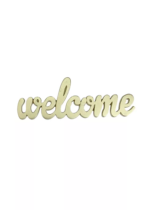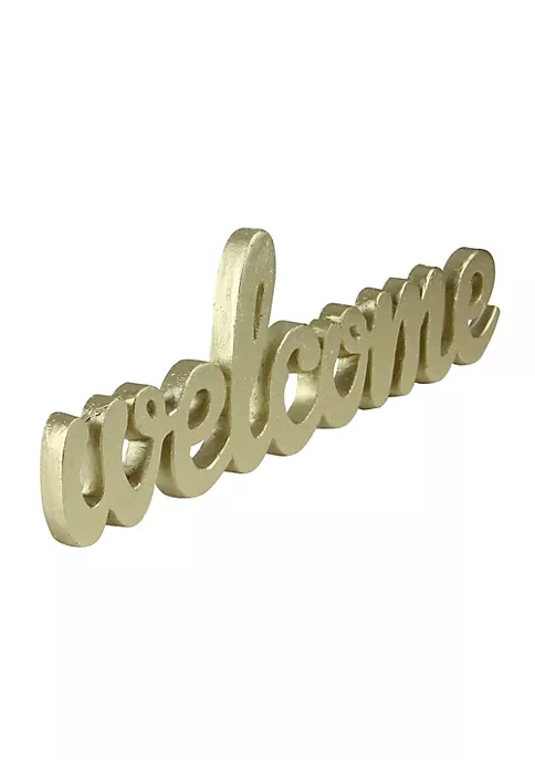 Feature a shimmering cut out welcome sign in a metallic gold in cursive writing