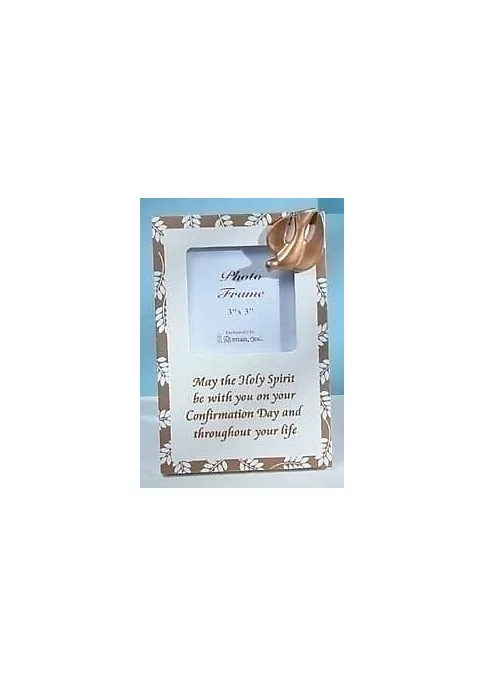 Keep your fondest Confirmation memory out all year with this picture frame that reads “May the Holy Spirit be with you on your Confirmation Day and throughout your life” with white and gold floral accents and dove at the right-hand corner